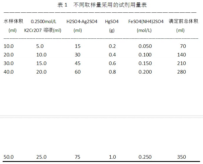 7.9 在特殊情況下,需要測定的試料在10.0mL到50.0mL之間,試劑的體積或重量要按表1作相應的調整。
