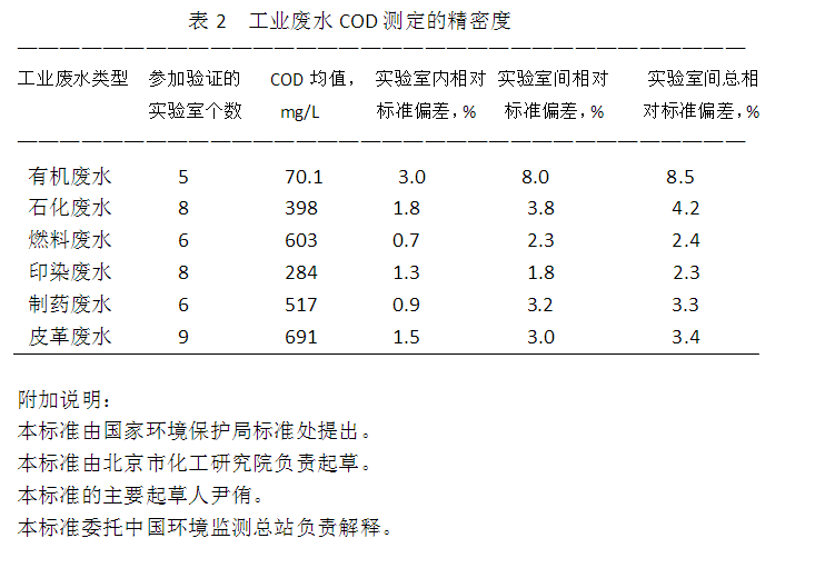 40個不同的實驗室測定COD值為500mg/L的鄰苯二甲酸氫鉀(4.7)標準溶液,其標準為20mg/L,相對標準偏差為4.0%。 8.2.2 工業廢水測定的精密度(見表2)。
