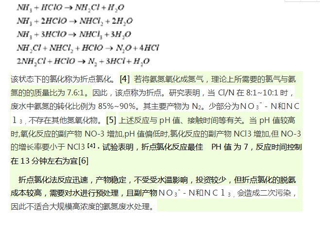 折點(diǎn)氯化法(Break Point Chlotination)是將氯氣通入廢水中達(dá)到某一點(diǎn),在該點(diǎn)時(shí)水中游離氯含量較低,而氨的濃度趨于零。當(dāng)氯氣通入量超過(guò)該點(diǎn)時(shí),水中的游離氯就會(huì)增多。多余的氯氣與水反應(yīng)生成次氯酸,次氯酸與氨氣反應(yīng)生成無(wú)害的氮?dú)猓浞磻?yīng)式如下