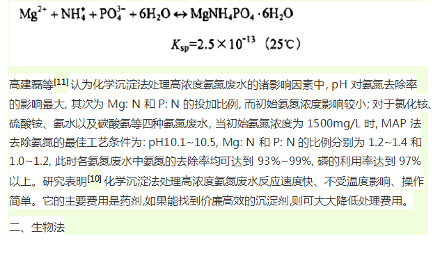 此方法氨氮處理效率較高(廢水經(jīng)處理后可達(dá)飲用水的標(biāo)準(zhǔn))、工藝流程簡(jiǎn)單、占地面積少等特點(diǎn)。但此技術(shù)所需催化劑價(jià)格昂貴,且需要高溫和高壓的設(shè)備,暫時(shí)不能作為廣泛應(yīng)用的處理方法,但若處理好催化劑與廢水匹配問(wèn)題,應(yīng)用前景廣泛。 化學(xué)沉淀法